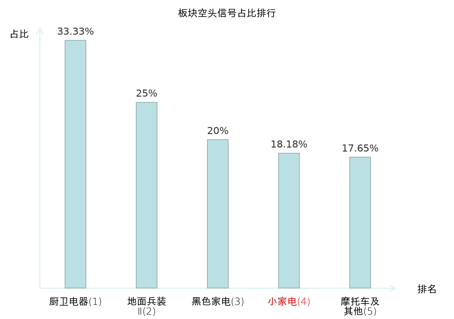 全市场所有行业板块中主力空头信号占比排名中,厨卫电器板块位居第一。服装家纺板块名次提升最快,较昨日上升124位。