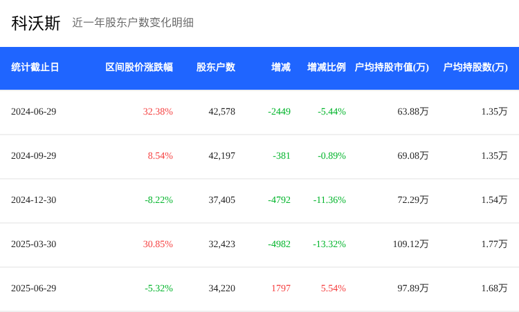 截至2025年6月30日,科沃斯(股票代码:603486)的股东户数为3.42万,较上期环比减少5.54%。与此同时,户均持股数量为17.95万股,环比减少了5.25%,户均持股市值为97.89万元,环比下降了10.29%。