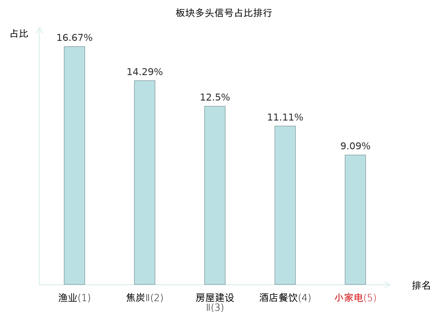 全市场所有行业板块中主力多头信号占比排名中,渔业板块位居第一。渔业板块名次提升最快,较昨日上升121位。