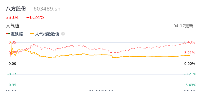 04月17日,八方股份收报33.04,股价涨幅6.24%,成交金额4446.21万元,换手率0.82%。