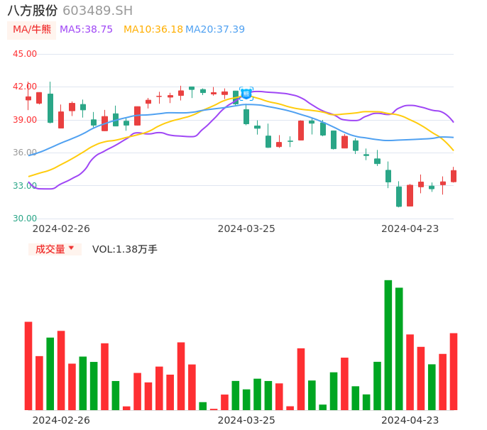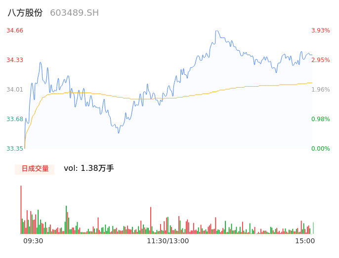 04月23日,八方股份收报34.38,股价涨幅3.09%,成交金额4710.42万元,换手率0.82%。