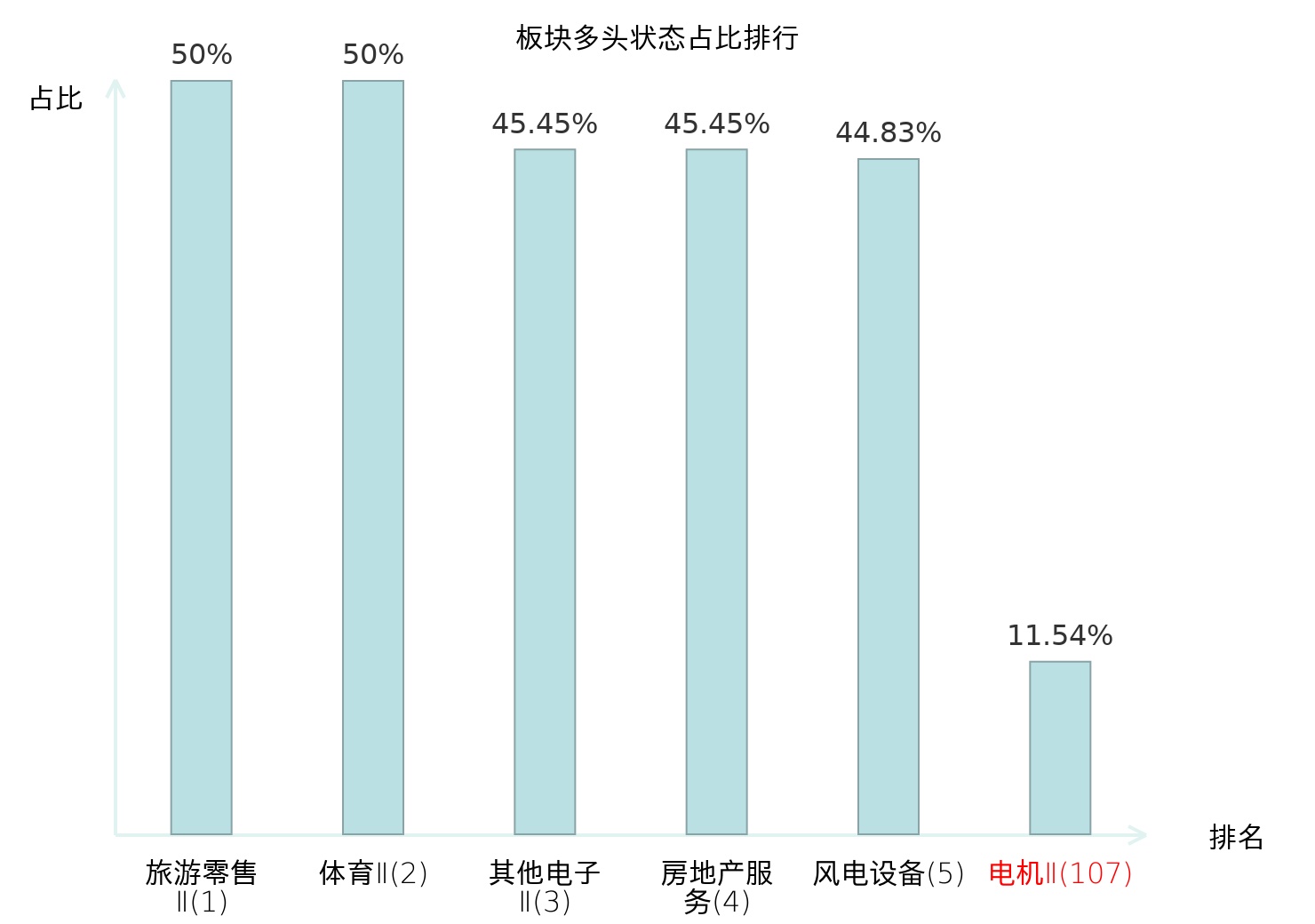 全市场所有行业板块中主力多头状态占比排名中,旅游零售Ⅱ板块位居第一。其他家电Ⅱ板块名次提升最快,较昨日上升112位。