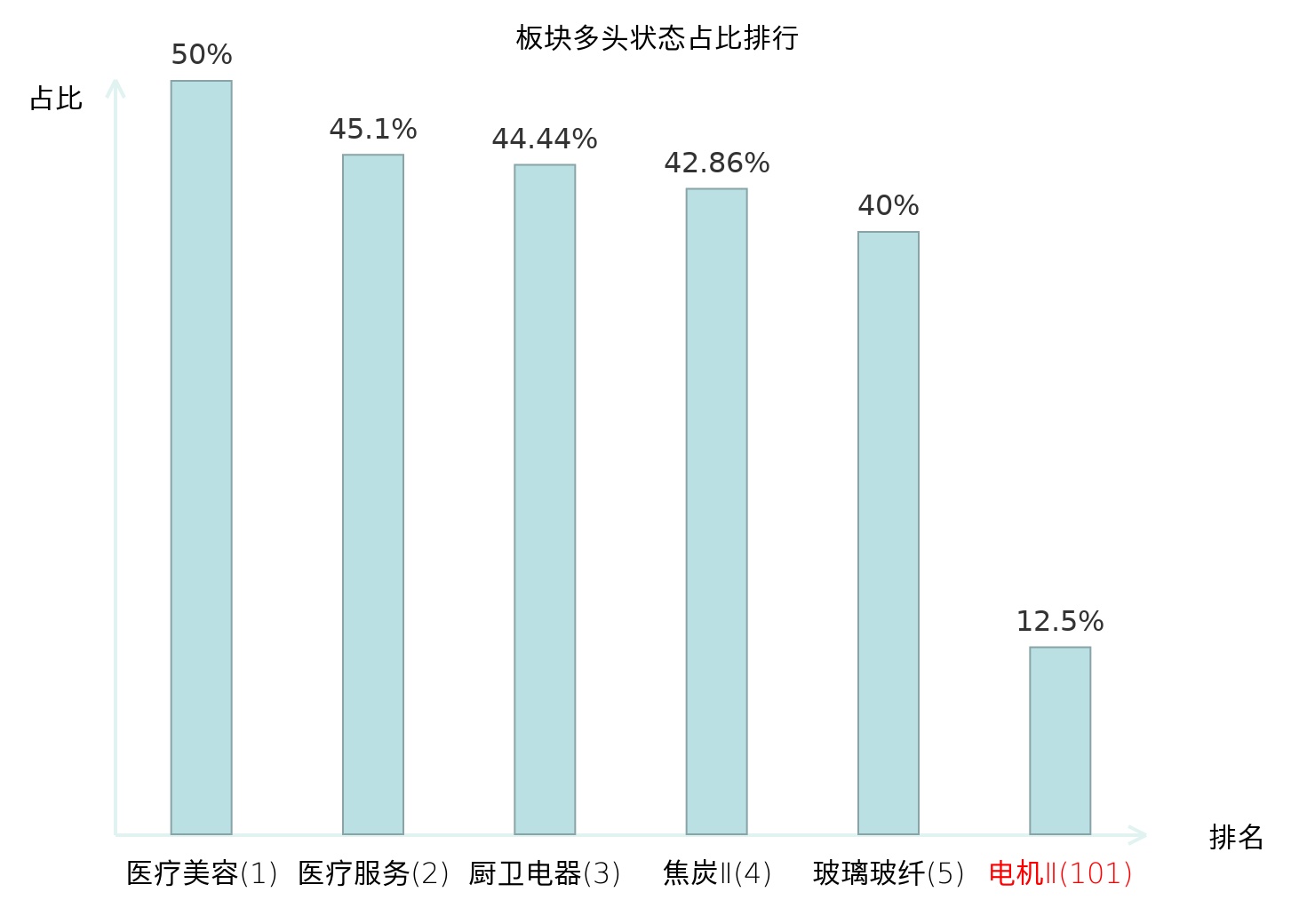 全市场所有行业板块中主力多头状态占比排名中,医疗美容板块位居第一。养殖业板块名次提升最快,较昨日上升90位。