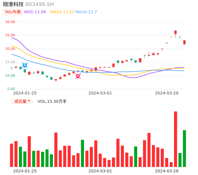 03月28日,翔港科技收报23.12,股价涨幅-4.03%,成交金额3.41亿元,换手率7.47%。