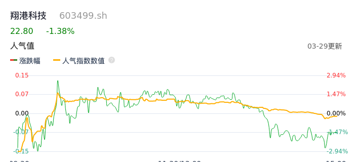 03月29日,翔港科技收报22.80,股价涨幅-1.38%,成交金额2.07亿元,换手率4.39%。