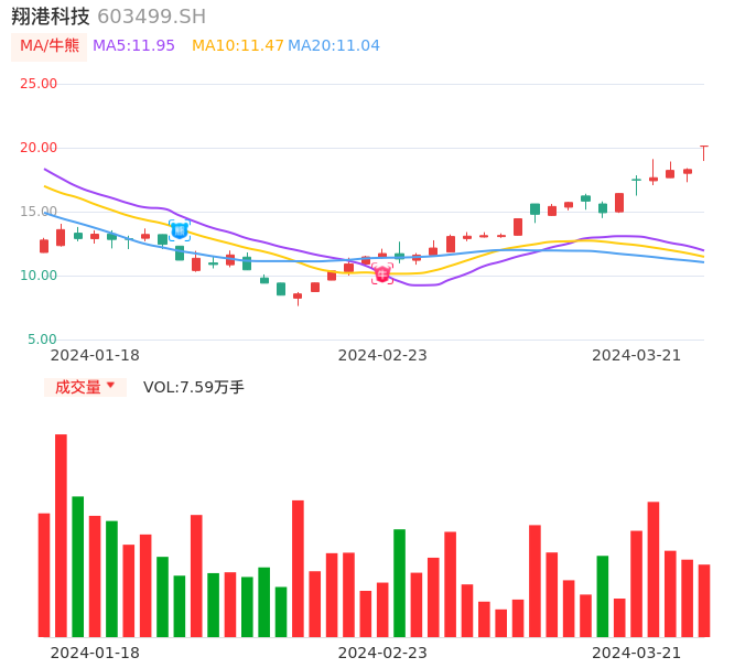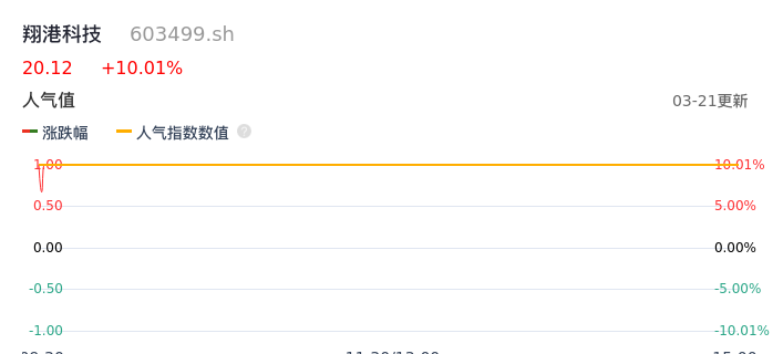 03月21日,翔港科技收报20.12,股价涨幅10.01%,成交金额1.52亿元,换手率3.77%。