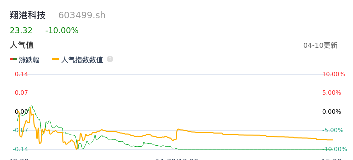 04月10日,翔港科技收报23.32,股价涨幅-10.00%,成交金额2.52亿元,换手率4.91%。
