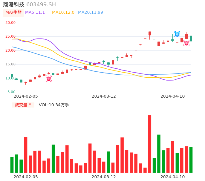 翔港科技近期出现日线级别牛点,与60分钟牛点出现共振,目前还未完全进入快速上涨通道,可积极关注。