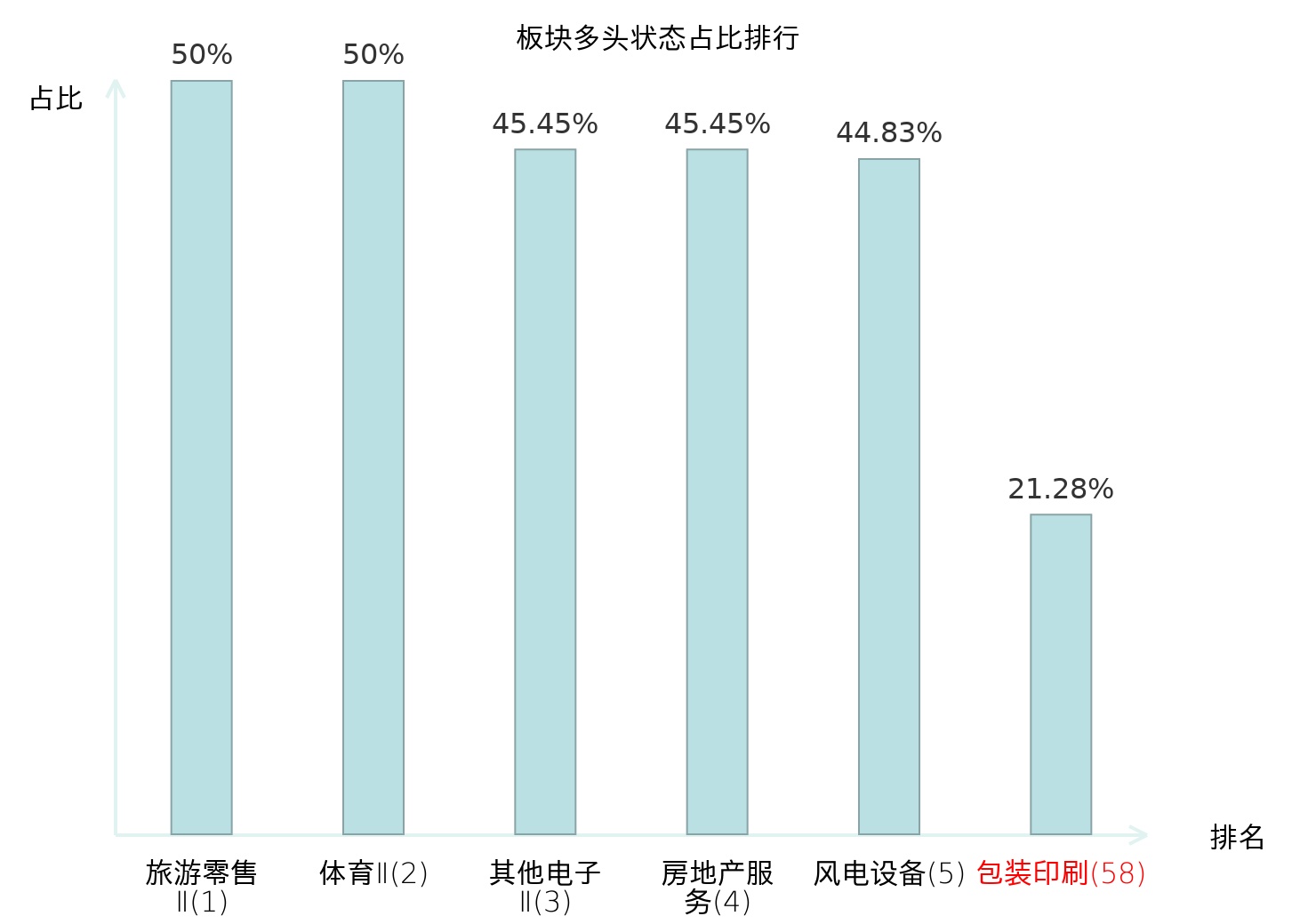 全市场所有行业板块中主力多头状态占比排名中,旅游零售Ⅱ板块位居第一。其他家电Ⅱ板块名次提升最快,较昨日上升112位。