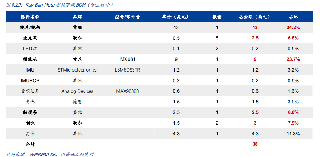根据WellsennXR对RayBanMeta智能眼镜BOM表的拆解数据,主板上的处理器SoC和存储器,以及主板之外的镜片/镜架和摄像头芯片,这4类器件的价值量最为靠前,因此我们认为在智能眼镜产业链上,处于以上4个器件环节的相关厂商在未来下游需求起量时将最为受益,我们看好相关国产供应商在以上环节的布局和卡位.2023年5月:发布全新的用于AR/XR/MR眼镜的648p单芯片硅基液晶(LCOS)面板。