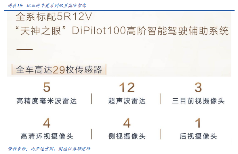 比亚迪2025年500万台级的产销规划中,预计60%-70%搭载高速NOA及以上智驾系统,拉动NOA成为10-15万元车型的普及型配置。我们认为,在比亚迪的引领之下,其他车企有望加速跟进智驾下沉,从而带动摄像头需求持续超预期,因此以车载CIS、镜头、模组为核心的产业链环节将全面受益。