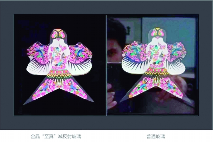 在金晶产品展示馆一个光线阴暗的角落,记者看到一串电灯泡横向排列,下面遮着一大片深色的遮光帘,神秘感十足。随着遮光帘缓缓收起,室内微弱的自然光洒在玻璃片上,上方的电灯逐渐亮了起来。