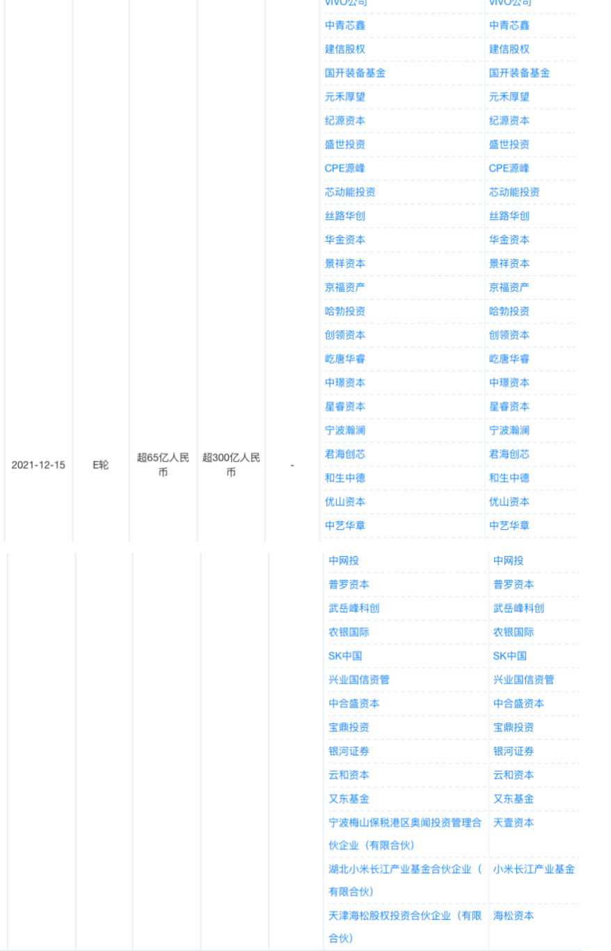 参投的知名机构则包括TCL创投、小米长江产业基金、vivo公司、华为哈勃投资、韩国SK集团旗下SK中国等。