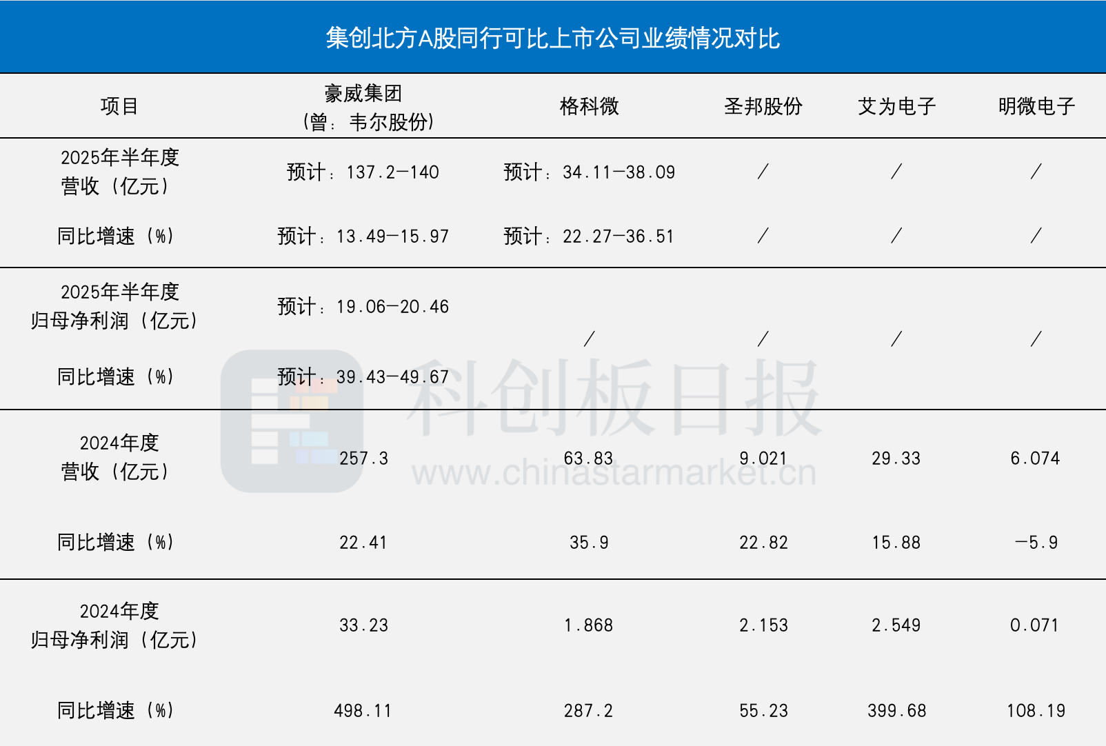 其中A股可比上市公司包括豪威集团(曾名:韦尔股份)、格科微、圣邦股份、艾维电子、明微电子。