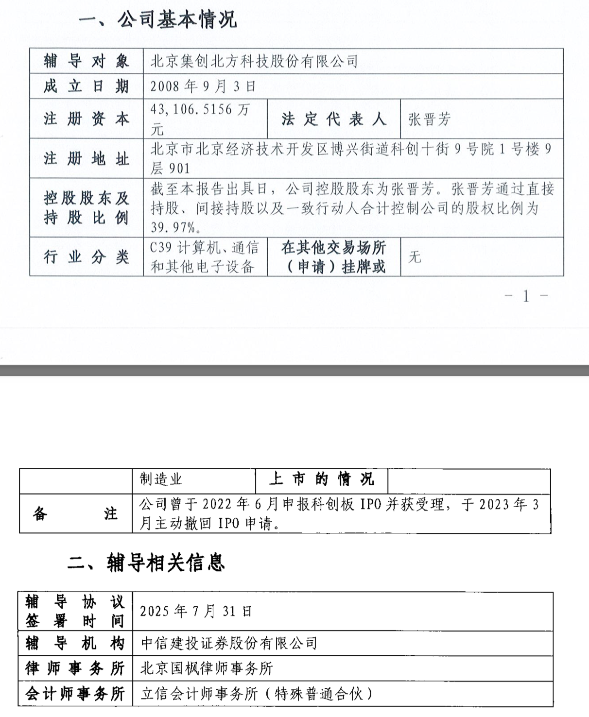 北京集创北方科技股份有限公司(下称:“集创北方”)于8月5日在北京证监局进行科创板IPO辅导备案登记,辅导机构为中信建投证券。