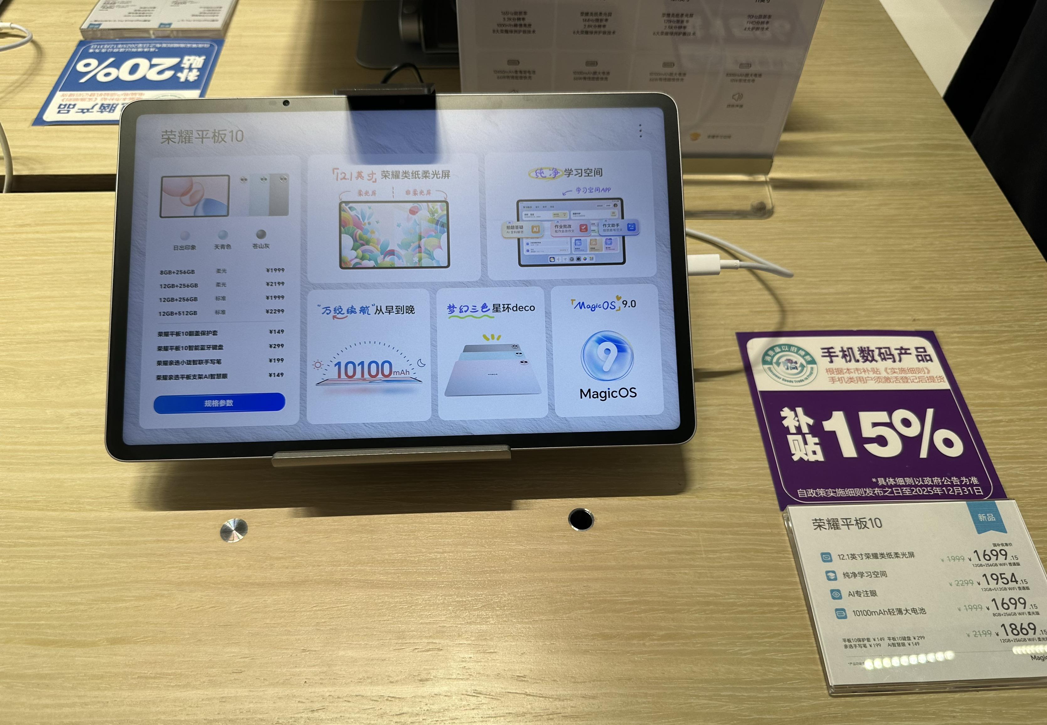 较便宜的千元价格带产品带动了智能平板的整体销量。据上海一家荣耀授权体验店销售人员介绍,国补优惠后基础售价为1699.15元起的荣耀平板10是该门店销量最大的平板。洛图科技(RUNTO)线上监测数据显示,今年上半年,荣耀在线上公开零售渠道TOP5品牌(Apple、华为、小米、荣耀、联想)中销量涨幅最高,达55.6%,X9、X8等千元价位机型贡献较大。