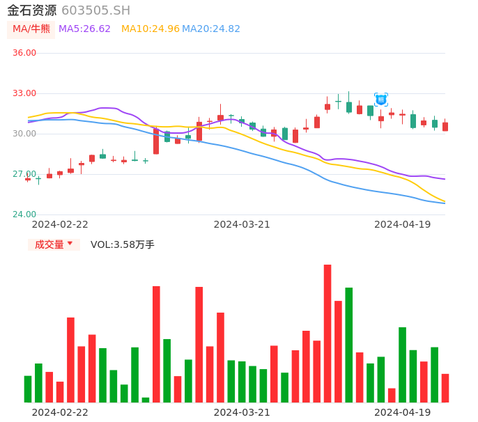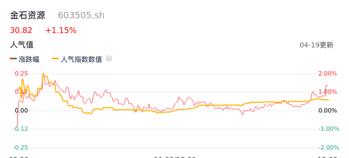 04月19日,金石资源收报30.82,股价涨幅1.15%,成交金额1.10亿元,换手率0.59%。