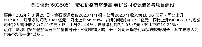 值得注意的是:2024年04月长城证券的肖亚平分析师,首次发布关于金石资源的研究报告,标题为:金石资源(603505):萤石价格有望走高 看好公司资源储备与项目建设。
