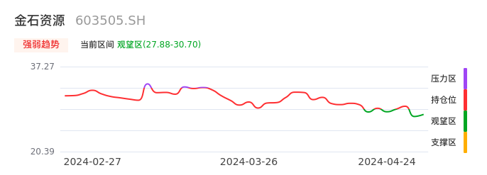 我们来看一下该股的九方特色指标强弱趋势的情况:金石资源近日从持仓区下穿到观望区,股价出现持续调整。短期出现止跌态势,后续重点关注能否再次站上多空分界点:30.70元。如未能有效突破则可能进入新一轮空头行情。