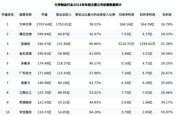 金石资源最新报告期数据为年报,下表汇总了化学制品行业内市值靠前的公司年报主要经营数据