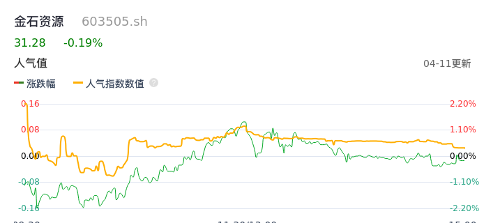 04月11日,金石资源收报31.28,股价涨幅-0.19%,成交金额1.41亿元,换手率0.75%。