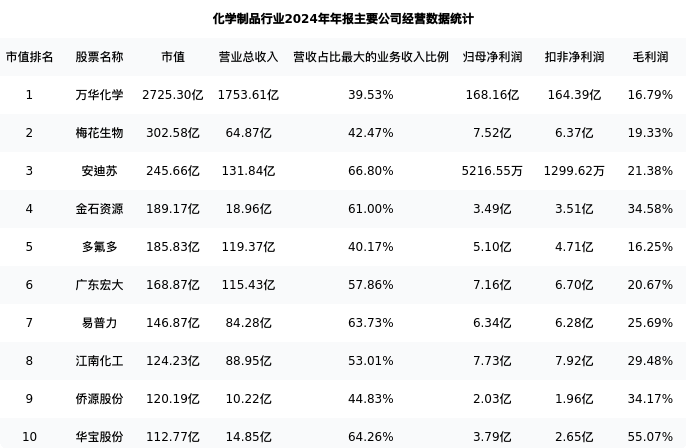 金石资源最新报告期数据为年报,下表汇总了化学制品行业内市值靠前的公司年报主要经营数据