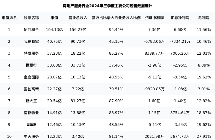 南都物业最新报告期数据为三季度,下表汇总了房地产服务行业内市值靠前的公司三季度主要经营数据
