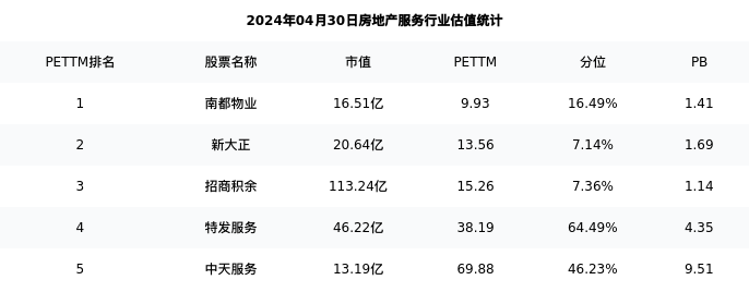 从估值角度看:南都物业最新市盈率PETTM为9.93,在行业内排名1/10,处于16.49分位。
