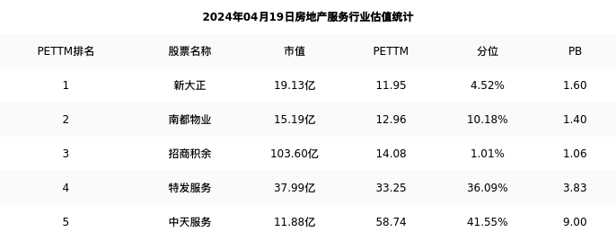 从估值角度看:南都物业最新市盈率PETTM为12.96,在行业内排名2/10,处于10.18分位。