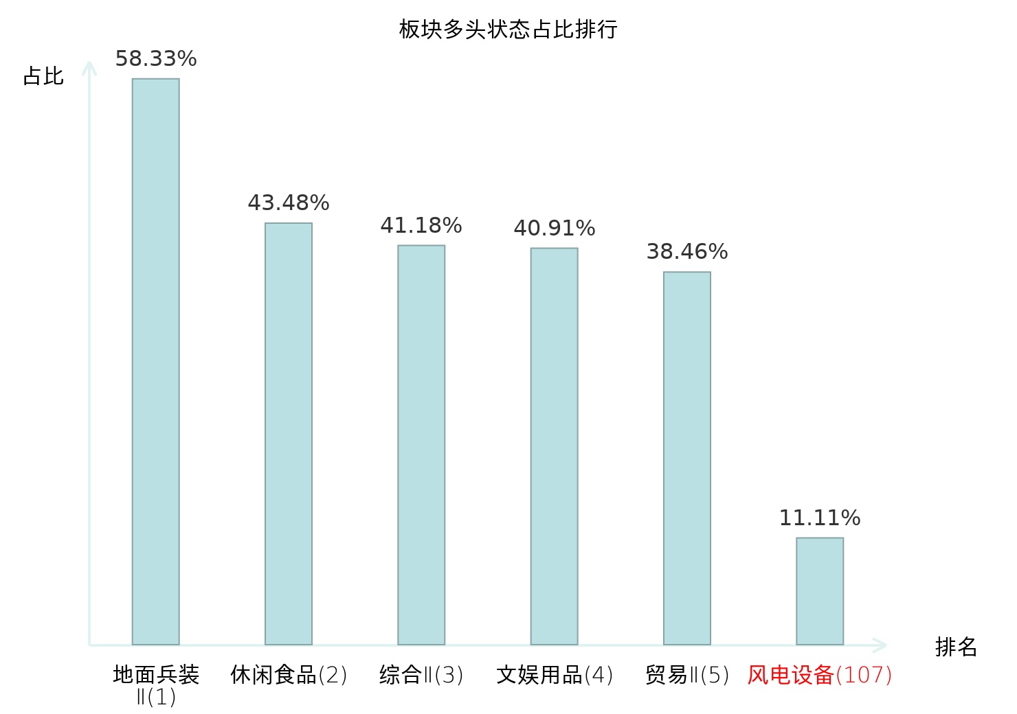 全市场所有行业板块中主力多头状态占比排名中,地面兵装Ⅱ板块位居第一。林业Ⅱ板块名次提升最快,较昨日上升90位。