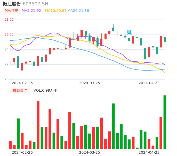 04月23日,振江股份收报24.98,股价涨幅-2.95%,成交金额1.75亿元,换手率4.92%。
