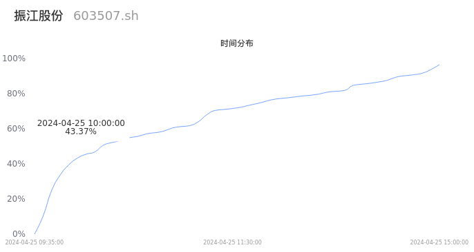 根据成交分布分析,该股票当天放量成交,成交清淡。时间上看,早盘前半小时成交量占据当天总成交量的43.37%;价格上看,成交呈现中间峰。成交分布分析主要研究股票成交的分布特性,不具有预测功能,请知悉。