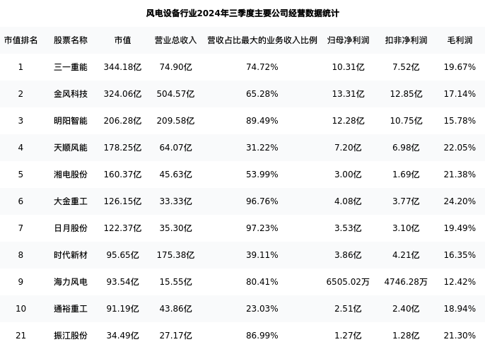 振江股份最新报告期数据为三季度,下表汇总了风电设备行业内市值靠前的公司三季度主要经营数据