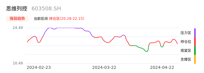 我们来看一下该股的九方特色指标强弱趋势的情况:思维列控自04月17日从观望区上穿到持仓区。股价近期在多头区域回调整理。后续重点关注多空分界点的争夺:20.28元。如未能有效站稳则可能重新回到空头行情。