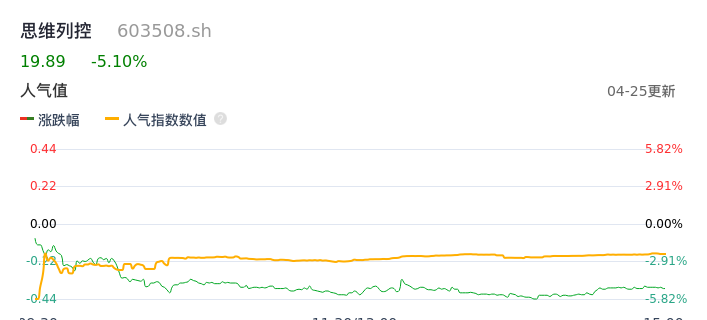 04月25日,思维列控收报19.89,股价涨幅-5.10%,成交金额2.28亿元,换手率2.98%。