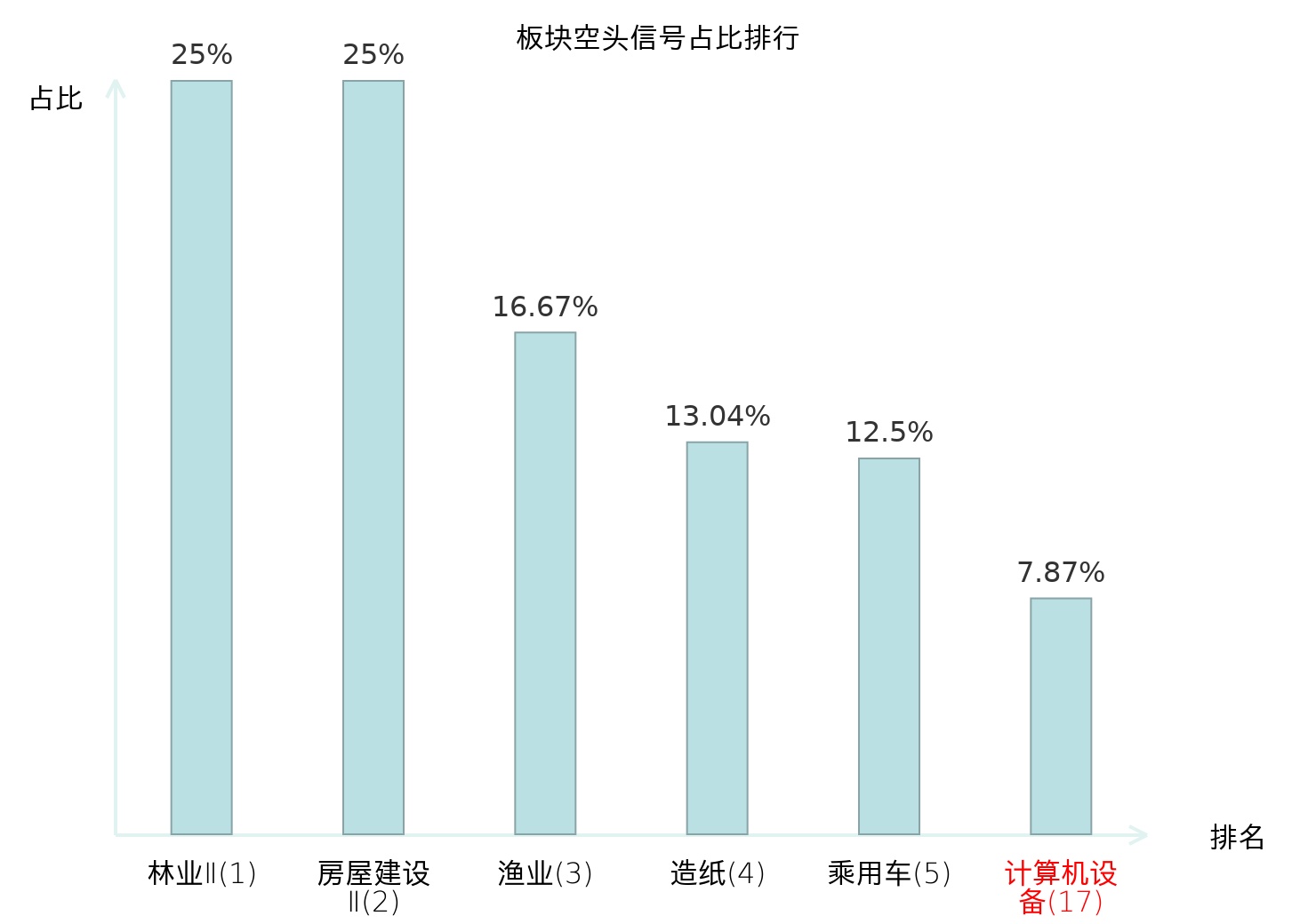 全市场所有行业板块中主力空头信号占比排名中,林业Ⅱ板块位居第一。通信设备板块名次提升最快,较昨日上升115位。
