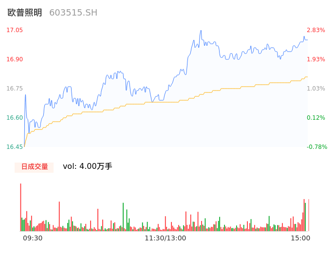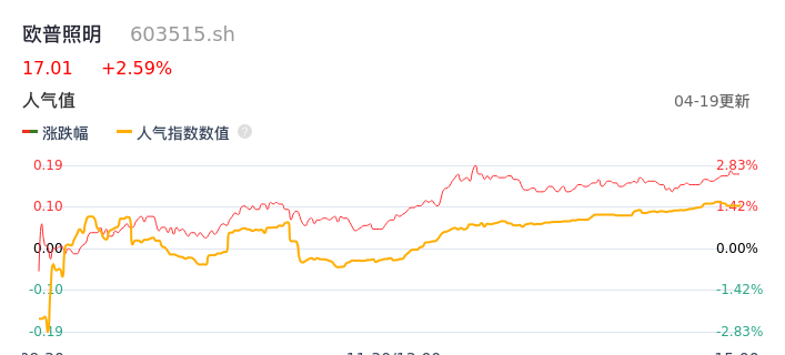 04月19日,欧普照明收报17.01,股价涨幅2.59%,成交金额6724.70万元,换手率0.54%。