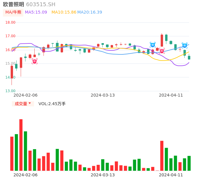 04月11日,欧普照明收报15.31,股价涨幅-1.80%,成交金额3784.45万元,换手率0.33%。