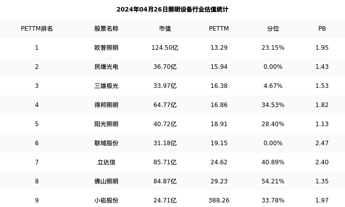 从估值角度看:欧普照明最新市盈率PETTM为13.29,在行业内排名1/10,处于23.15分位。