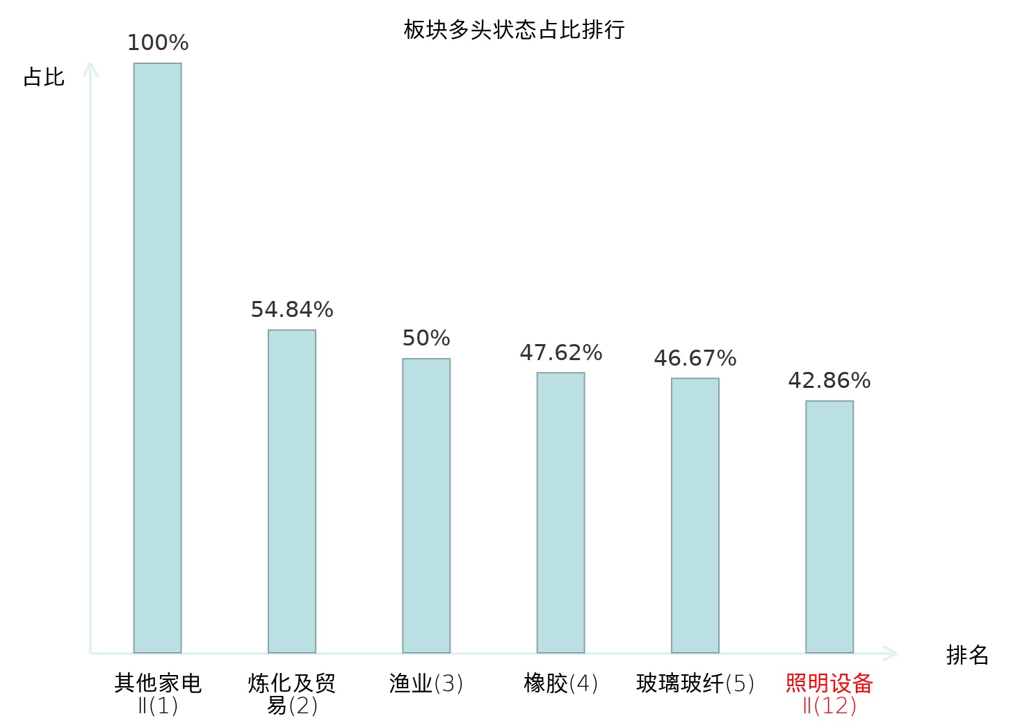 全市场所有行业板块中主力多头状态占比排名中,其他家电Ⅱ板块位居第一。铁路公路板块名次提升最快,较昨日上升37位。