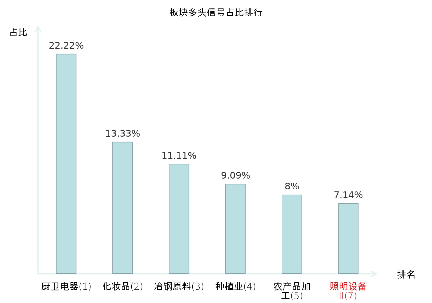 全市场所有行业板块中主力多头信号占比排名中,厨卫电器板块位居第一。化妆品板块名次提升最快,较昨日上升104位。