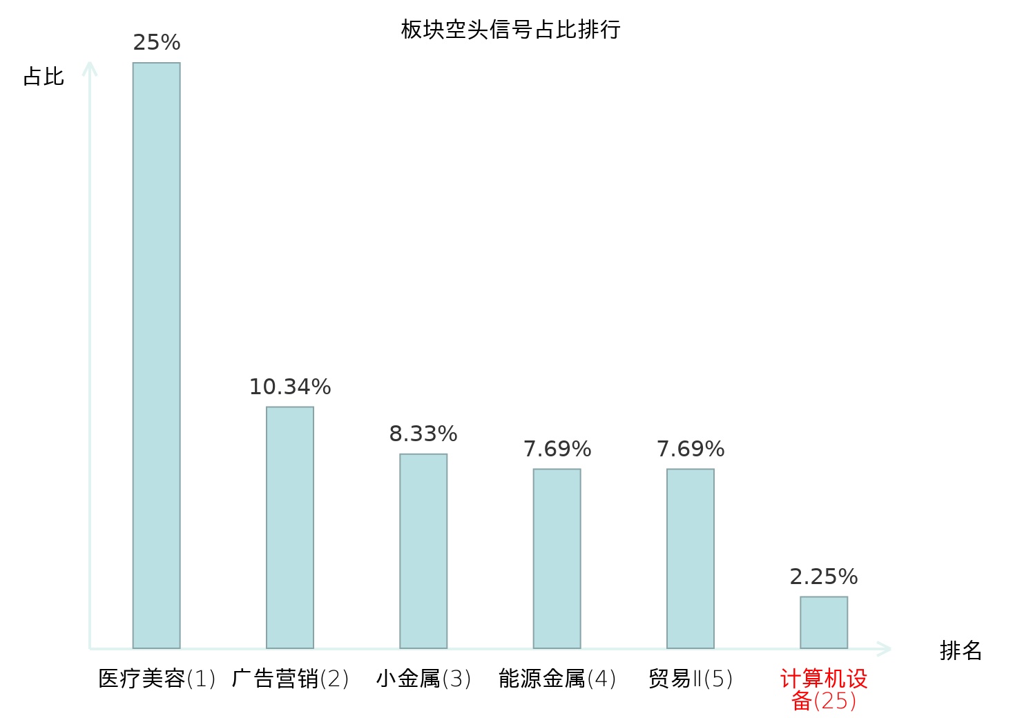 全市场所有行业板块中主力空头信号占比排名中,医疗美容板块位居第一。广告营销板块名次提升最快,较昨日上升113位。