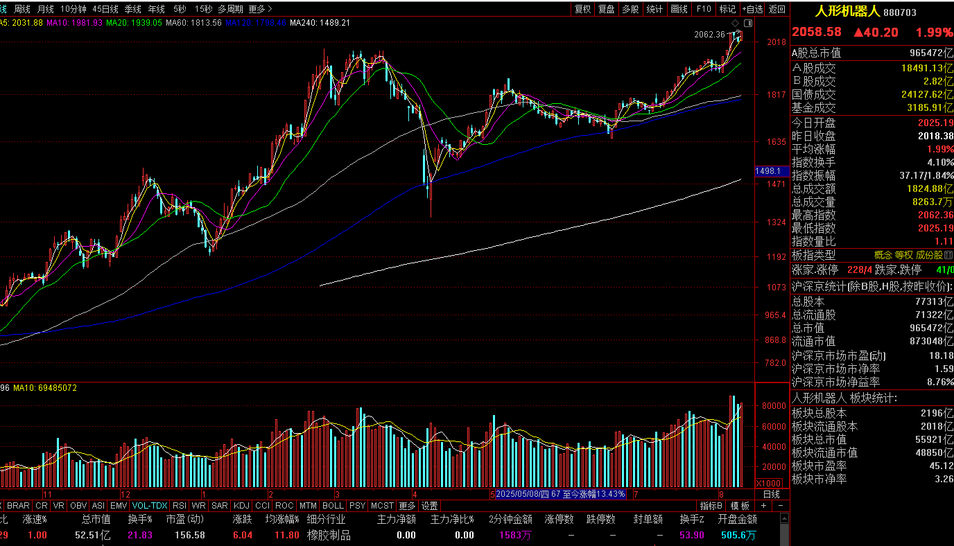 三大指数放量上扬,沪指上涨0.34%,深成指上涨1.46%,创业板指上涨1.96%。个股整体呈现涨多跌少态势,上涨家数达4188家,剔除ST股后,涨停个股有78家,跌停个股仅4家,市场情绪修复迹象显著。两市总成交额为1.82万亿,较前一交易日增加1167亿,成交量保持在较高水平
