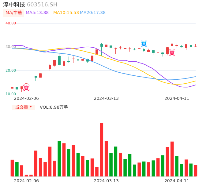 04月11日,淳中科技收报30.03,股价涨幅0.27%,成交金额2.73亿元,换手率4.50%。