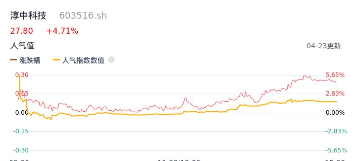 04月23日,淳中科技收报27.80,股价涨幅4.71%,成交金额3.37亿元,换手率6.12%。