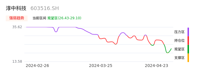 我们来看一下该股的九方特色指标强弱趋势的情况:淳中科技近日从支撑区回到观望区。股价经过前期快速下跌后已经出现止跌迹象。下跌动能有所衰竭,股价目前处于反弹阶段,后续重点关注能否站上多空分界点:29.10元。如未能有效突破则说明弱势反弹行情结束。后续可能再次进入空头行情。