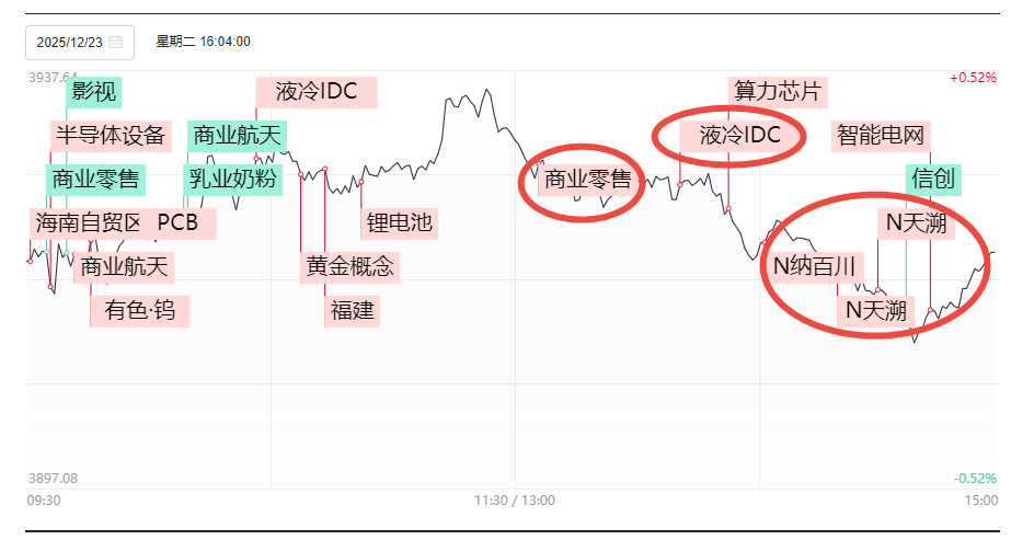 上午的盘面我们中午也分析了,是一个赛道拉升吸血,小票整体调整的行情,而下午的盘面有整体板块异动的就2个,一个商业零售这块,一个则是液冷,而新股则是下午指数回暖,情绪不佳,市场资金投机的一种表现,遇事不决炒新股。