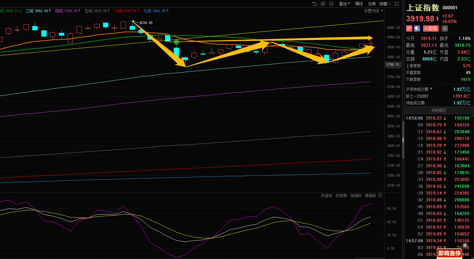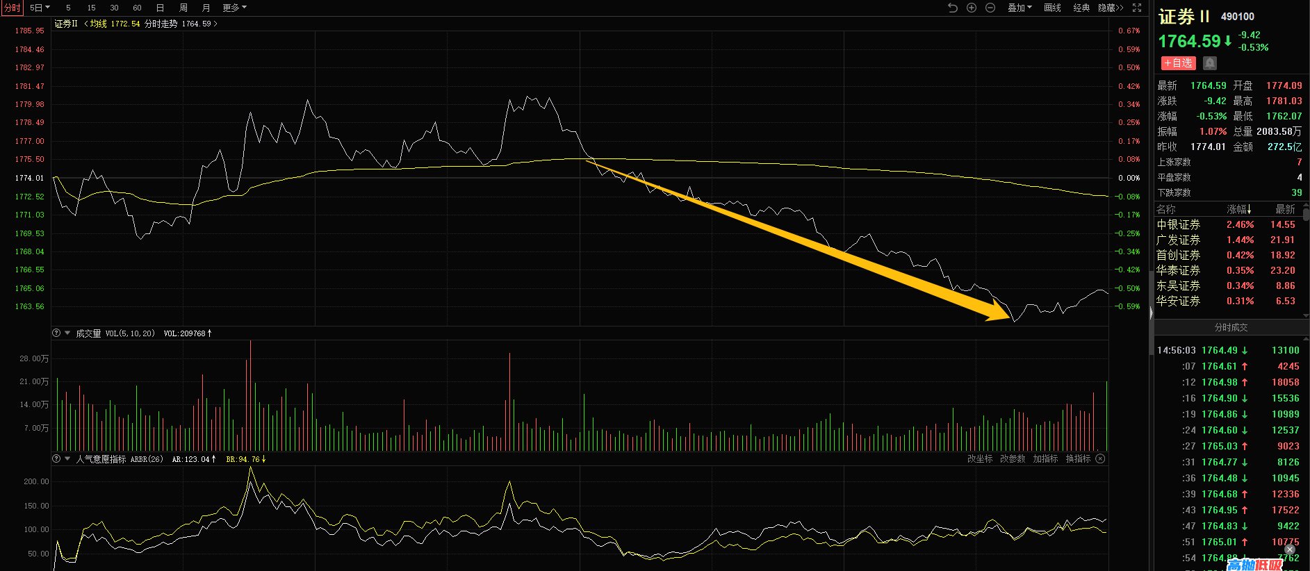 加上下午量能未能延续放大,截止收盘较午间少了200亿增量,没有增量,抛压带来的影响会扩大,同时从技术面上可以看到沪指颈线位未能有效的突破,而下午首先怂的是大金融证券其次是银行,一开盘就头也不回的回落,只有保险稍微有点抵抗,但还是把指数整体带下来,一度翻绿。