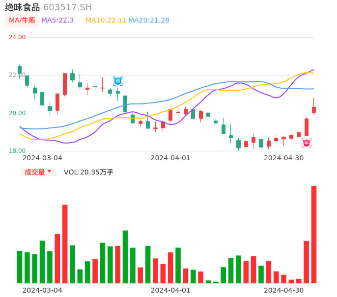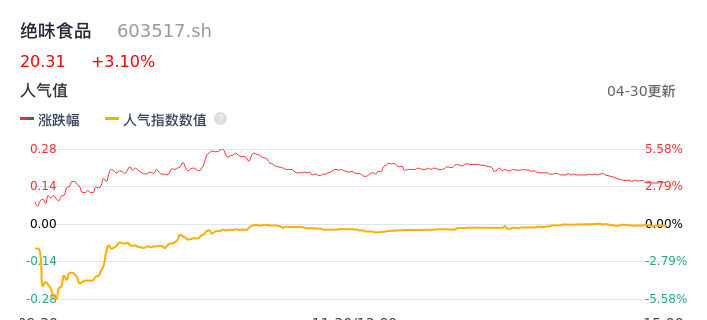 04月30日,绝味食品收报20.31,股价涨幅3.10%,成交金额4.15亿元,换手率3.28%。