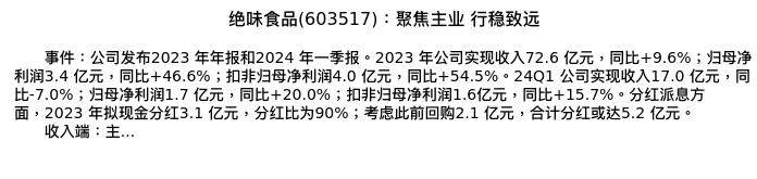 值得注意的是:2024年04月广发证券的符蓉/胡慧/杨琳琳分析师,首次发布关于绝味食品的研究报告,标题为:绝味食品(603517):聚焦主业 行稳致远。
